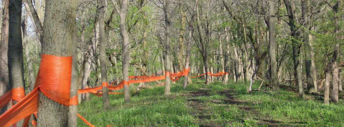 This was early Spring and the woods are just beginning to transform from dormant, winter grey to very light green from emerging buds on the trees and underbrush. The orange ribbon winds for approximately 1/4 mile 50 feet from the roadside.